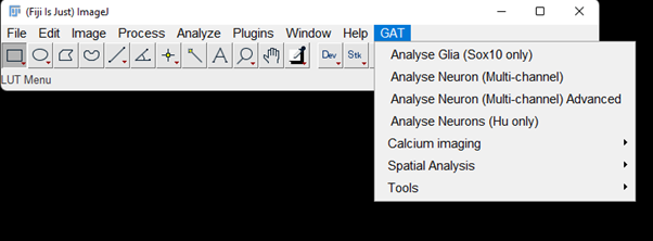After all the installation and configuration, when you restart FIJI, you should see the GAT menu appear on FIJI.
