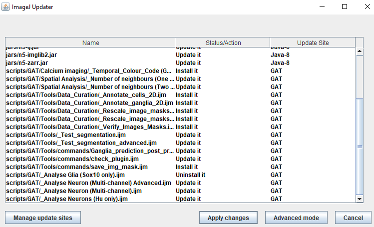 All the dependencies and scripts from the update sites selected above will appear in the ImageJ Updater.