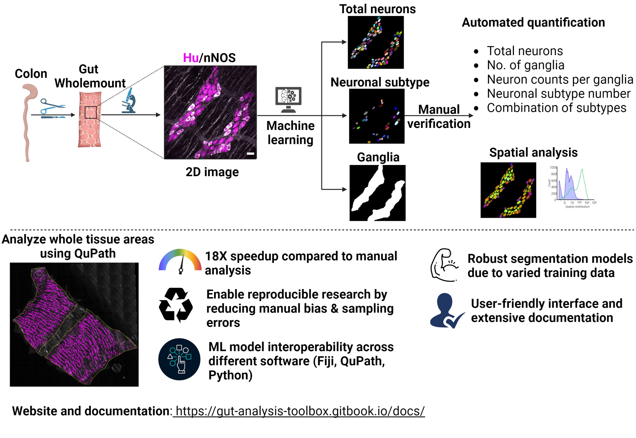 Gut Analysis Toolbox enables semi-automated analysis of the neuronal and glial distribution within the gut wall (enteric nervous system). It uses a combination of FIJI macros, StarDist and deepImageJ under the hood to do the heavy lifting with automated segmentation.
