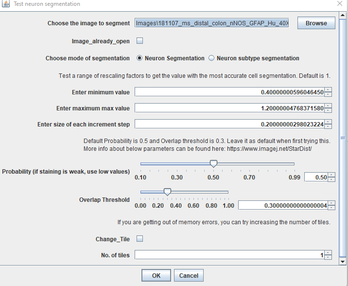 The above parameters are all entered into the StarDist plugin in Fiji. For more details about StarDist and how it works, refer to this FAQ.