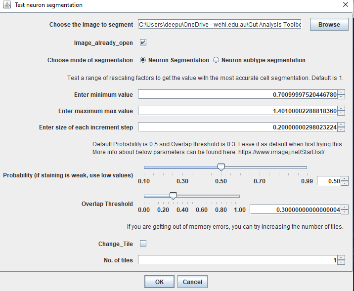 Keep in mind that this image has been resized and segmentation performed on this image to obtain the ROIs. Use this step to zoom into the image and verify the segmentation is working. If you’re not happy, you can test a range of values. If you’d like to test a range of values, close all the images and rerun “Test Segmentation”. In the dialog box, enter the minimum and max values. Here I’m testing 0.7, 0.8, 0.9, 1, 1.1, 1.2, 1.3 and 1.4. For this, I’ve entered