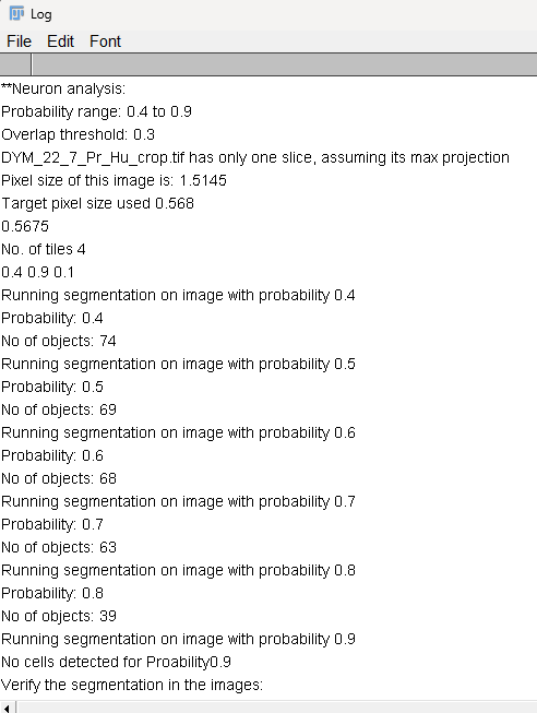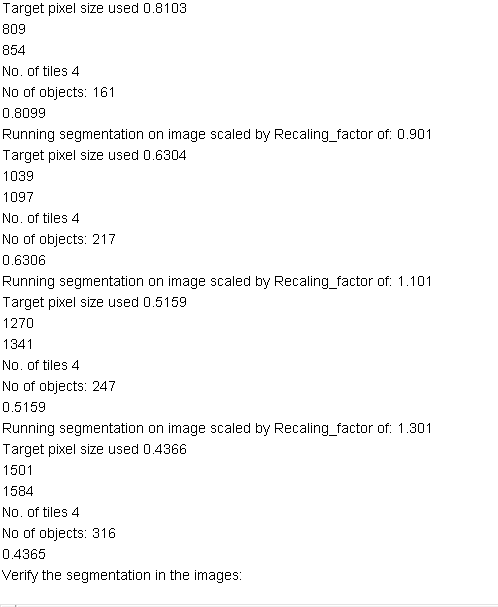 In the Log window, you will see the no of detected objects at each rescaling factor with corresponding pixel size: