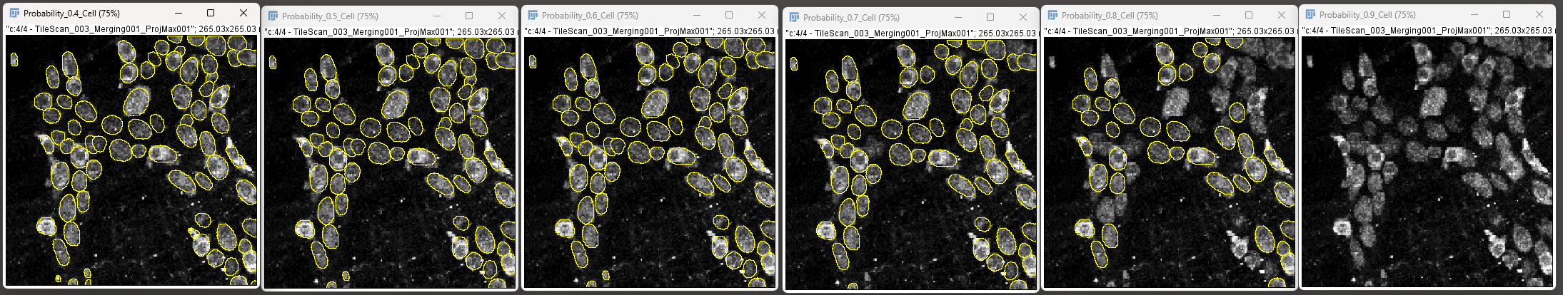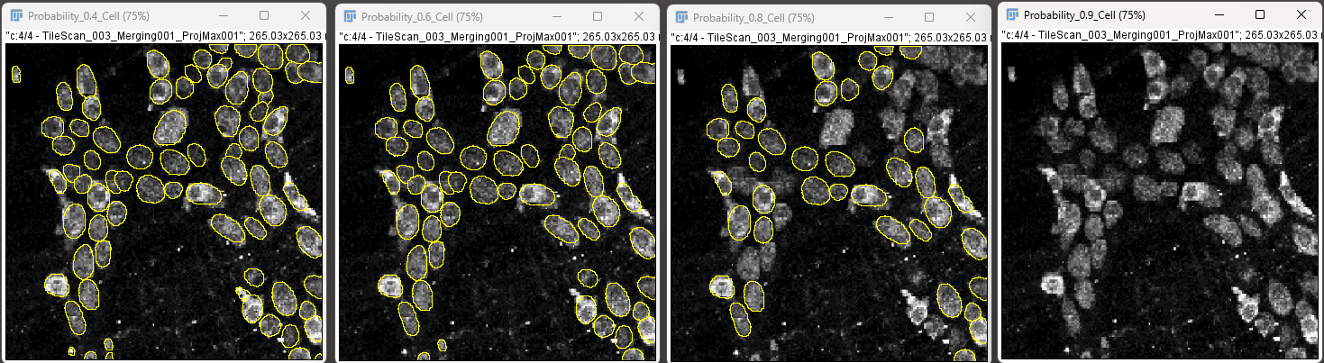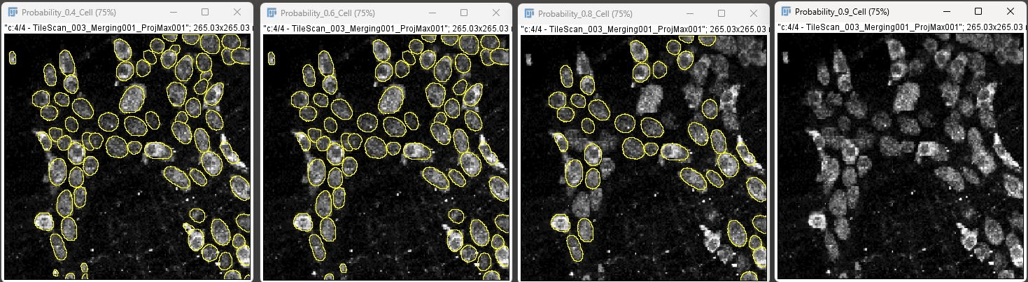 For example, the image below demonstrates cell detection with probability thresholds of 0.4, 0.6, 0.8 and 0.9.