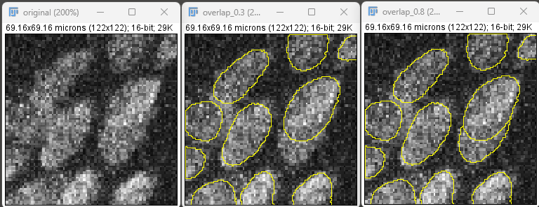 Lowering overlap threshold will increase detection of overlapping cells, but it may start detecting more cells where there aren’t. The default value may work in most cases. It is recommended to lower this if the tissue isn’t stretched well and cells are on top of each other. Increasing this will lower the number of overlapping cells detected.