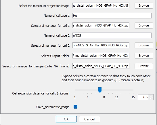 The value was determined to be 6.32 ± 5.17 µm (n=3643 cells, 130 ganglia, Mean ± S.D., N=11), which is rounded to 6.5 µm for ease of use within GAT. This was only determined for mouse tissue. So, for analysis in mouse tissue we have set 6.5 µm distance as a threshold radius within which cells are considered to be a nearest neighbour. Keep in mind that this distance is an edge to edge distance. GAT offers the option to customise this threshold value if needed.
