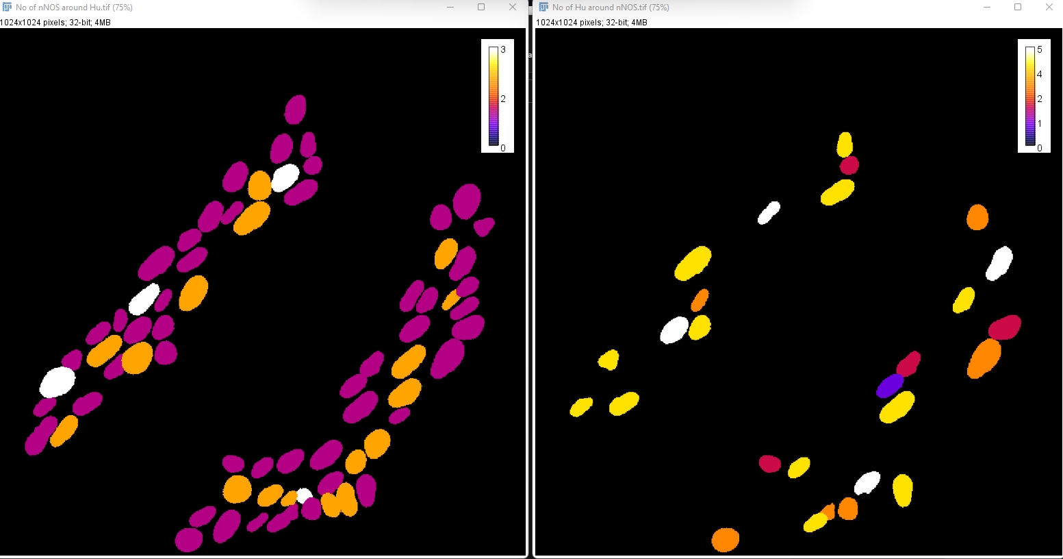 The parametric image produced for no. of nNOS around each Hu (neuron) is shown as an example (calibration bar added manually):