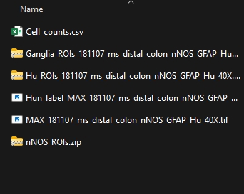We will be using a sample image with Hu and nNOS labelling for this workflow: 181107_ms_distal_colon_nNOS_GFAP_Hu_40X.tif