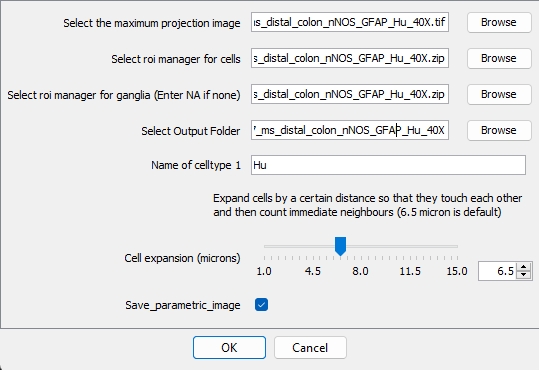 Background: The greater the number of cells, the larger the number of neighbours surrounding each cell. This can be used as to characterise any changes in cell distribution within the gut wall. For a cell to be considered a neighbour we still have to specify a maximum distance range within which it is considered a neighbour. This parameter can be affected by tissue stretch, so, the distance between neurons within a ganglia was objectively assessed within images of mouse tissue with varying levels of stretch. The distance between cells in the ganglia was measured using the local thickness plugin within FIJI.