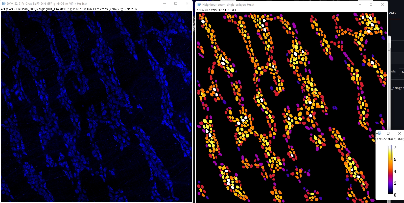 You can attach a calibration bar specifying the number of neurons around each cell as well by going the menu within FIJI -> Analyze -> Tools -> Calibration Bar.